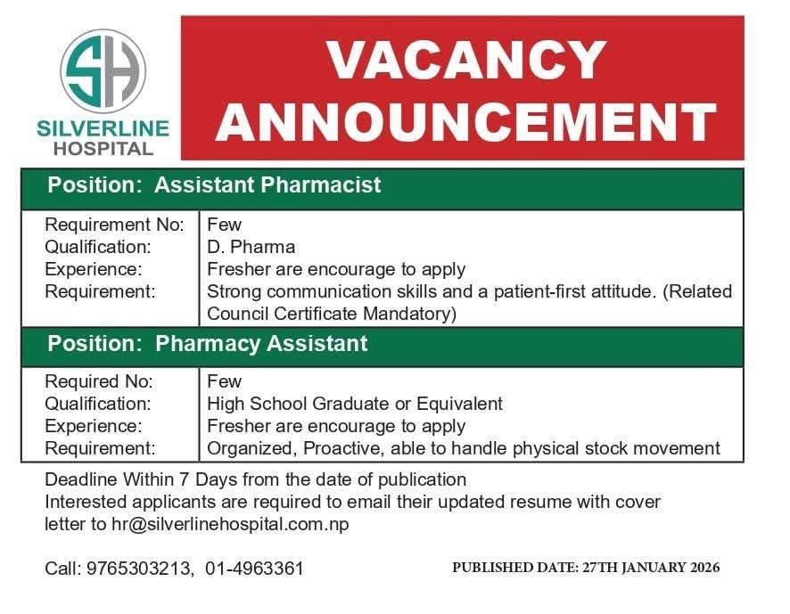 - Submission Guidelines: Interested applicants should submit their updated resume along with a cover letter to hr@silverlinehospital.com.np. Applications must be received within 7 days of the publication date (Published: 27th January 2026).