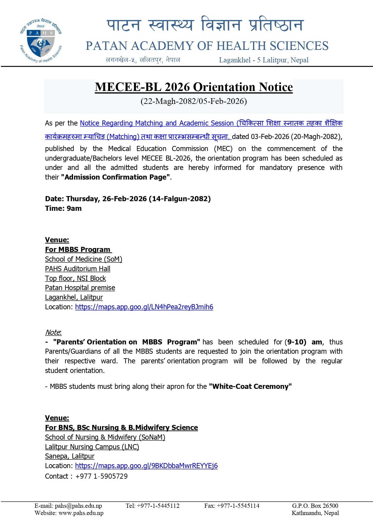 The Patan Academy of Health Sciences (PAHS) has issued an official notice regarding the Orientation Program for MECEE-BL 2026 admitted students.