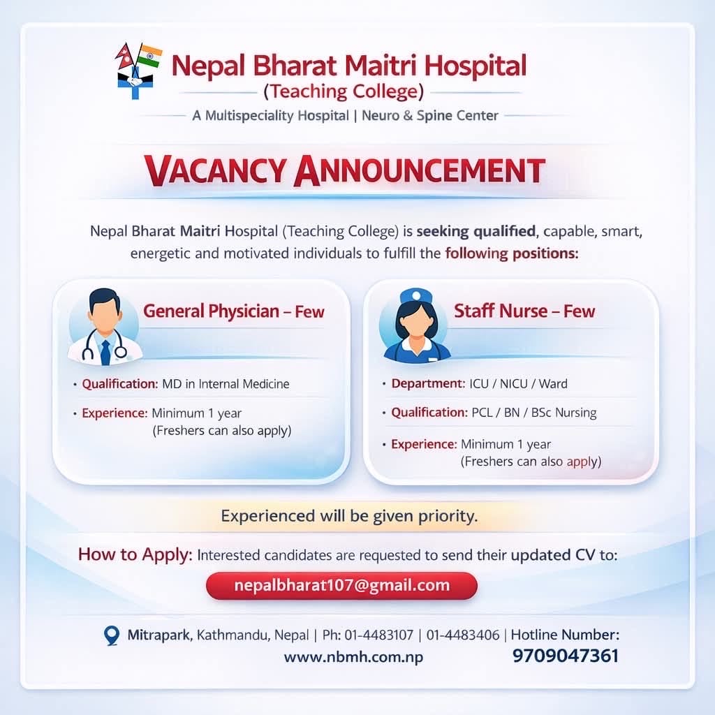 Nepal Bharat Maitri Hospital- Vacancy for Physician and Staff Nurse