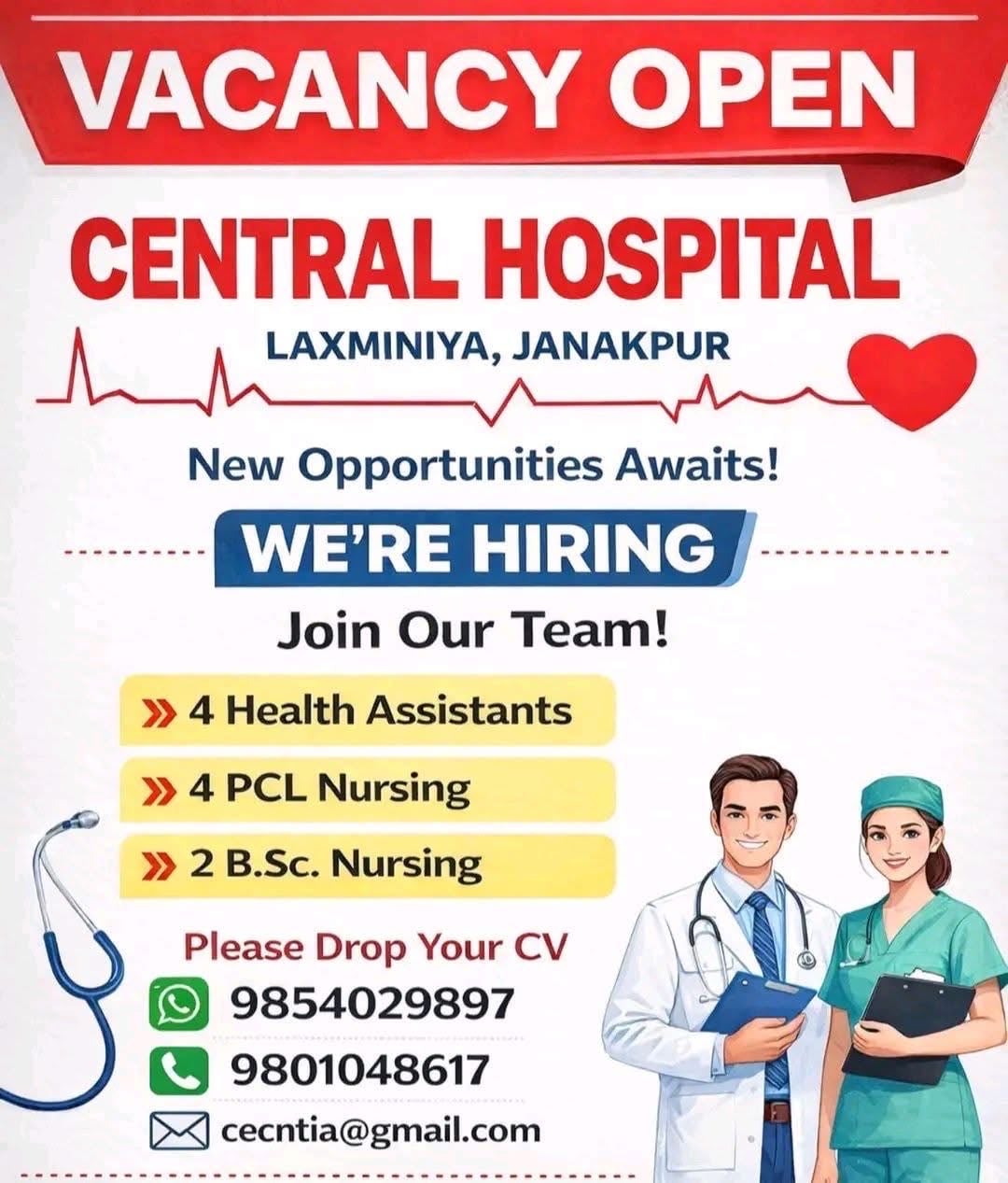 Cetral Hospital, Janakpur- vacancy for H.A, Staff Nurse and BSc Nursing