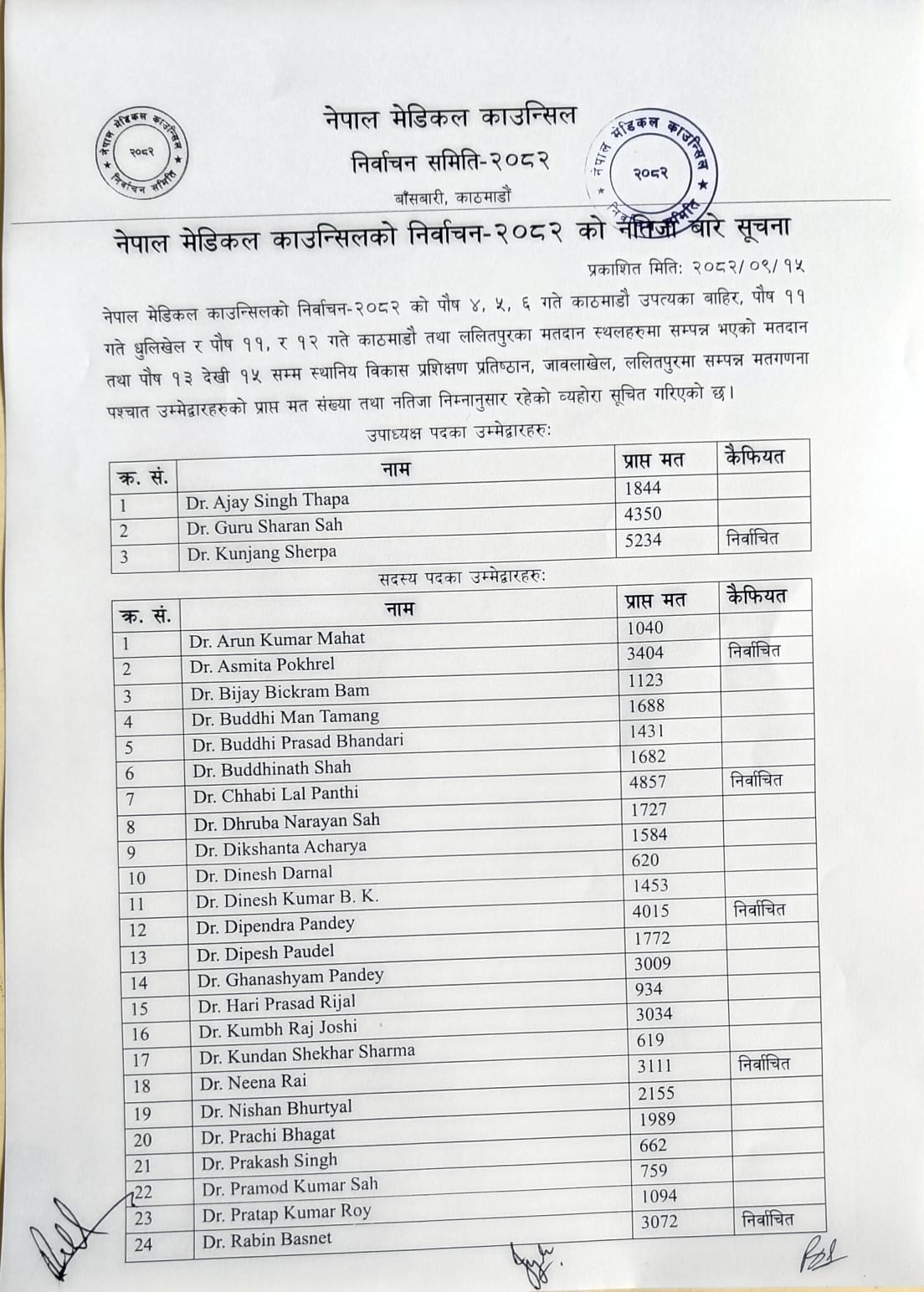 Other elected members include Dr. Yoveen Kumar Yadav, who received 3,628 votes, Dr. Asmita Pokhrel with 3,404 votes, Dr. Samrat Parajuli with 3,282 votes, and Dr. Neena Rai, who acquired 3,111 votes.
