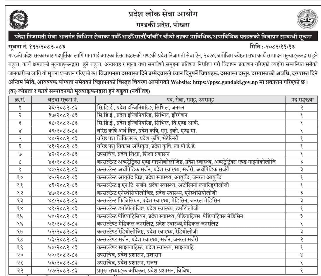 गण्डकी प्रदेश लोक सेवा आयोगले प्रदेश निजामती सेवा अन्तर्गतका #स्वास्थ्य सेवाको चौथो, पाँचौ, छैटौँ, सातौँ र नवौ तहका Vacancies 2082.11.13