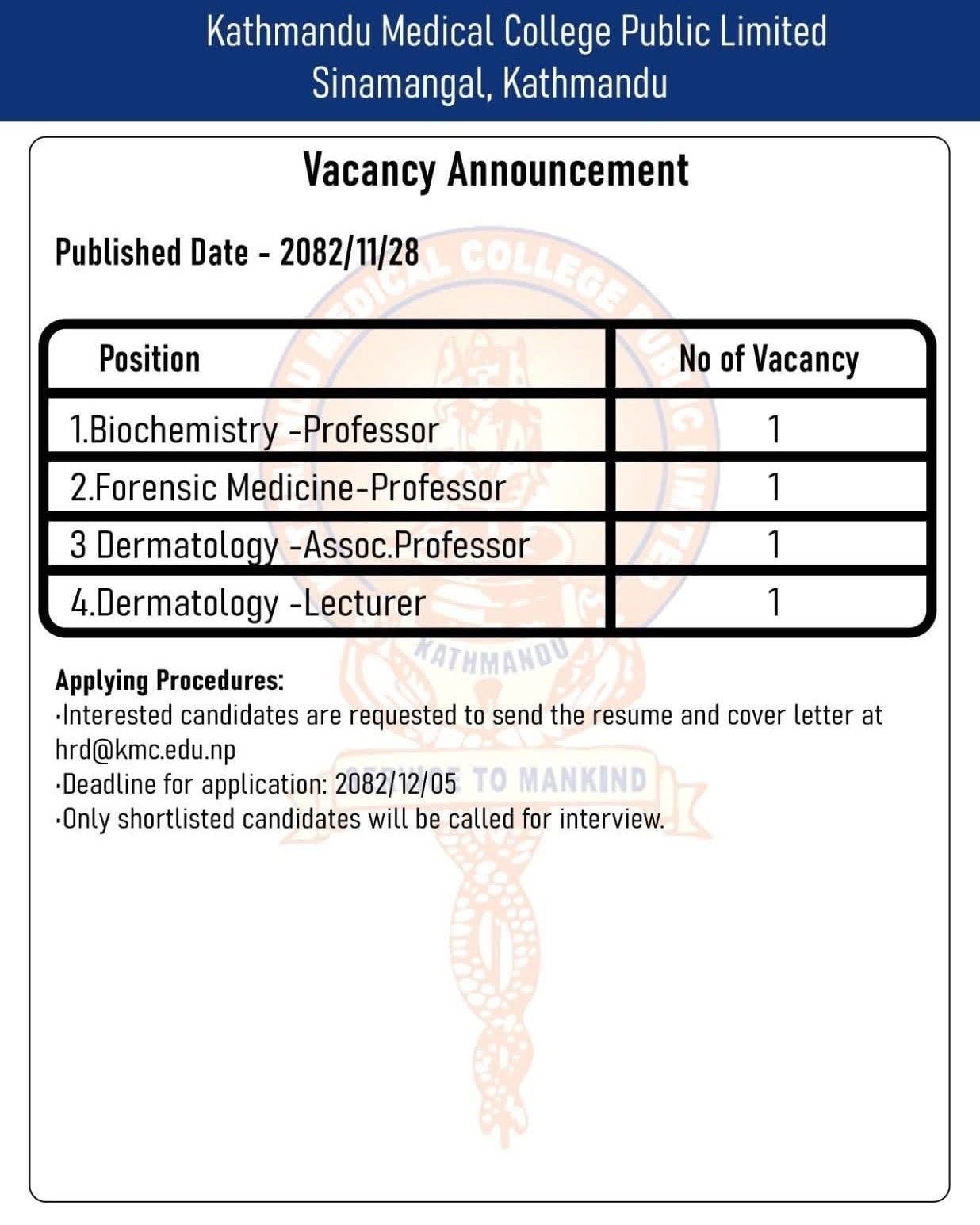 Kathmandu Medical College - Vacancy for Medical Faculties
