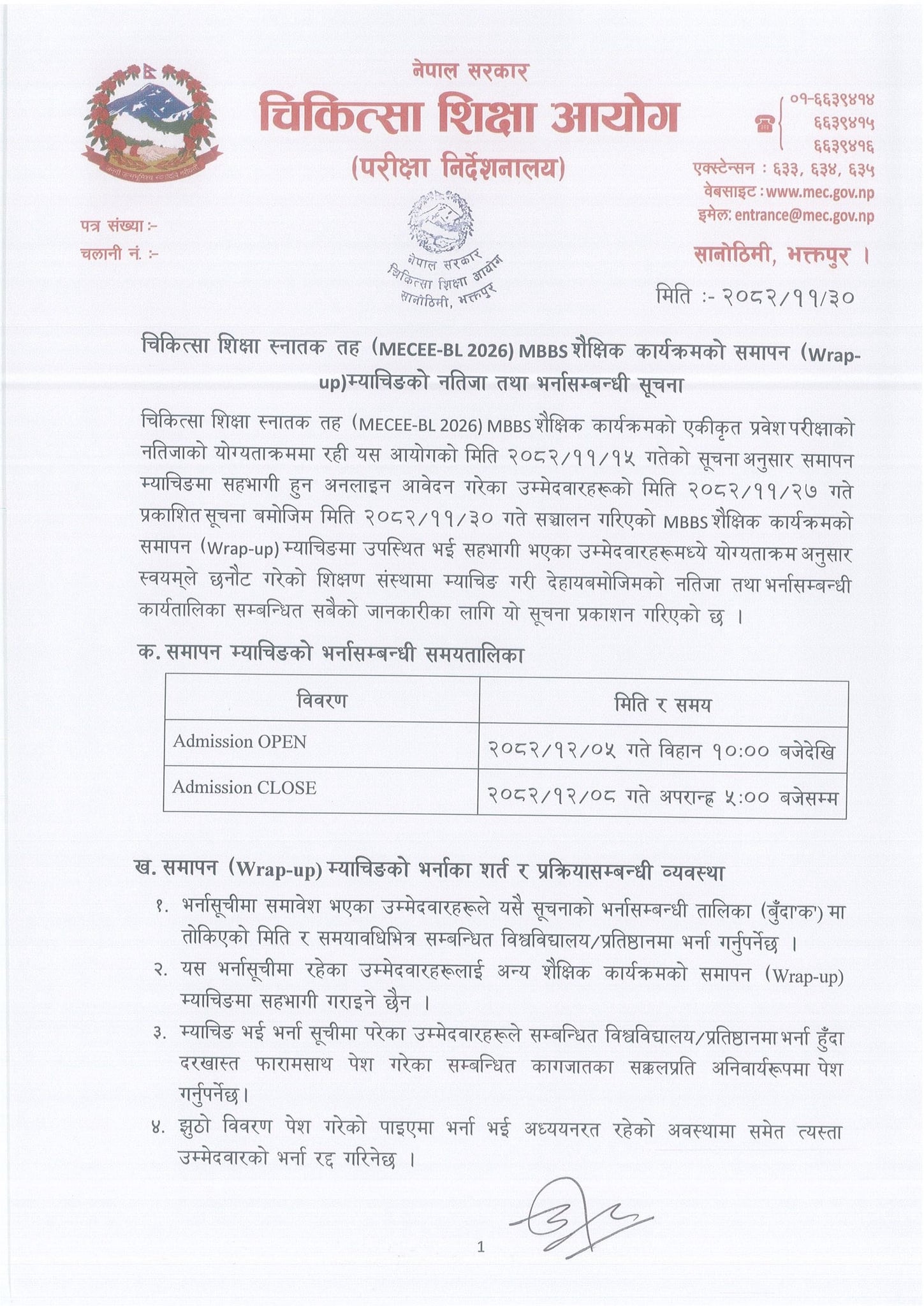 चिकित्सा शिक्षा स्नातक तह (MECEE-BL 2026) MBBS शैक्षिक कार्यक्रमको समापन (Wrapup)म्याचिङको नतिजा तथा भर्नासम्बन्धी सूचना