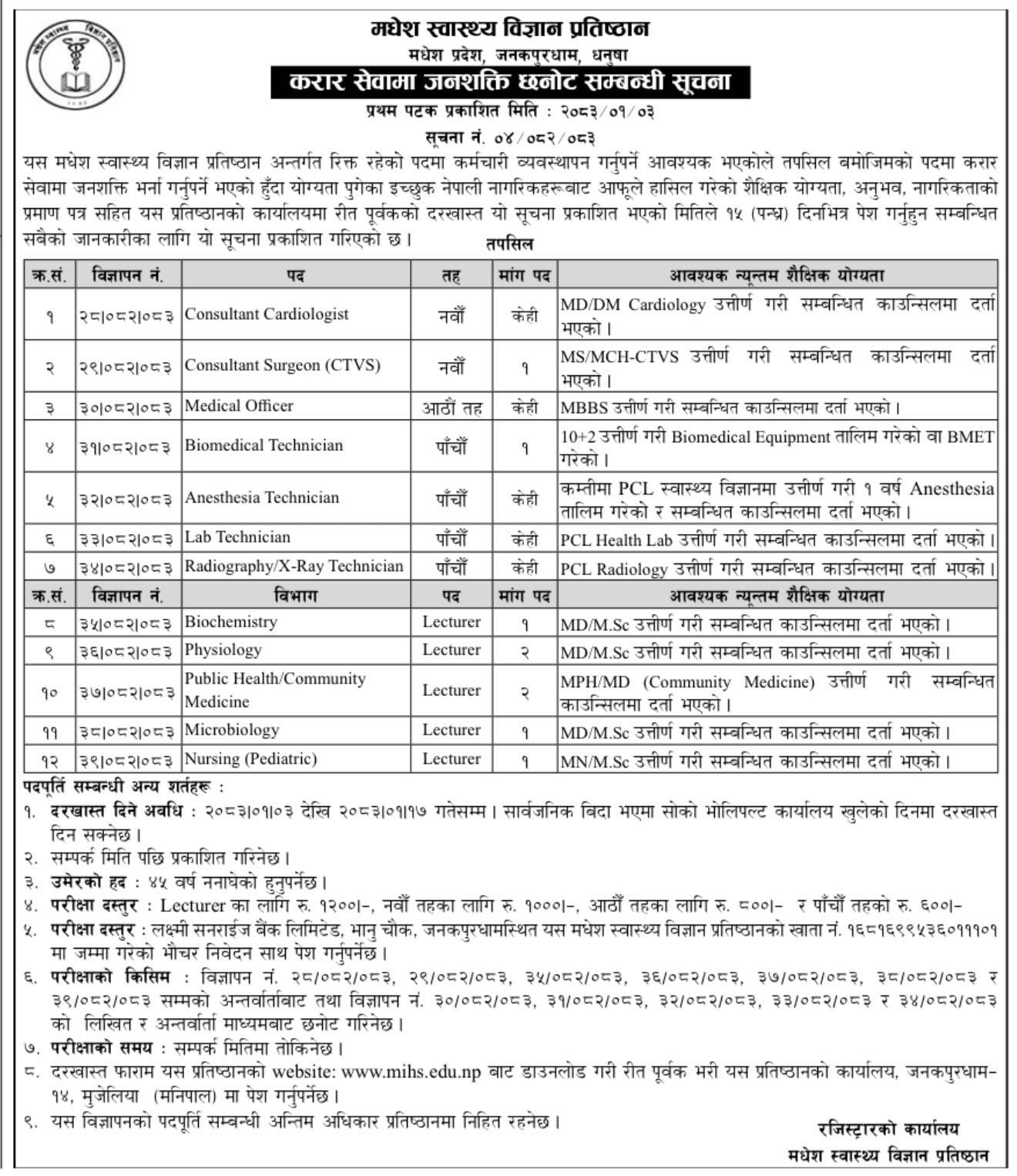 Madhes Institute of Health Science- Vacancy for Medical officers,Consultants, Nursing Faculties and others