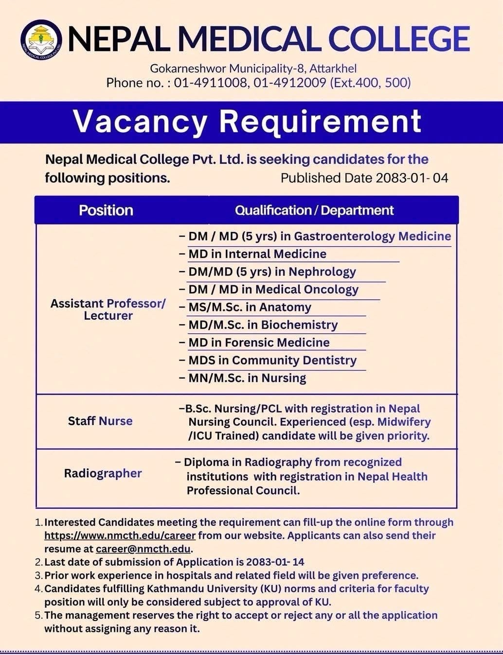 Nepal Medical College Jorpati - Vacancy for Medical and Nursing faculties and staff